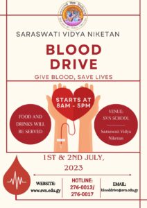 Saraswati Vidya Niketan is thrilled to announce the fifteenth biannual blood drive, scheduled to take place on the 1st and 2nd of July, 2023. We believe in fostering a culture of compassion, unity, and service within our school community and beyond. To make this year’s blood drive an outstanding success, we are calling upon our dedicated students to collaborate with us in recruiting donors. Together, we can make a meaningful impact and save lives.